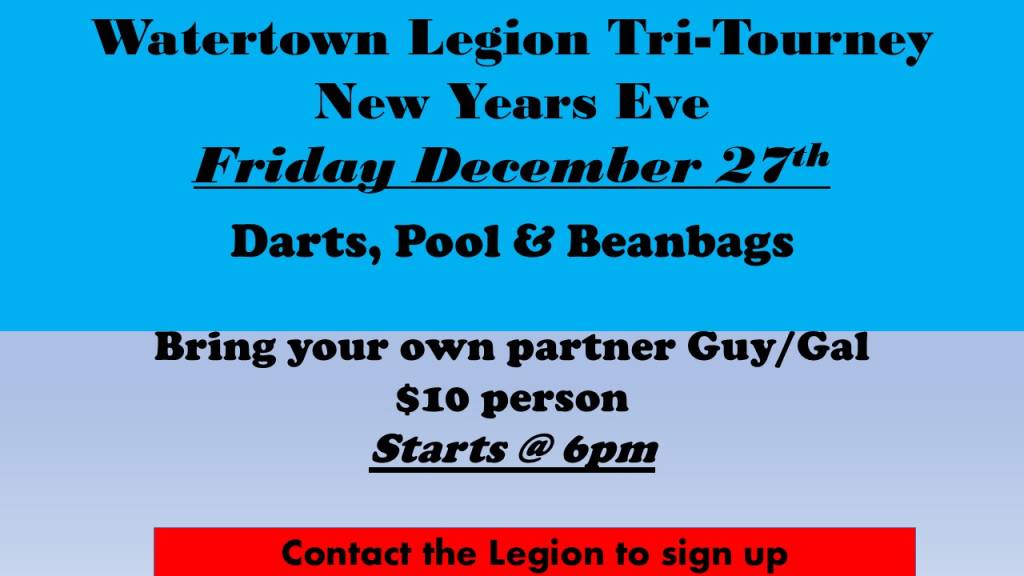 Watertown American Legion Annual New Year’s Tri Tourney Event; Darts, Pool & Beanbags