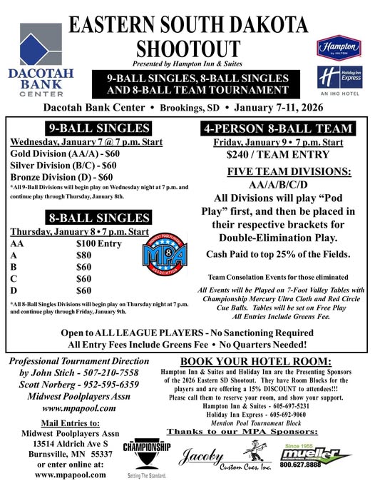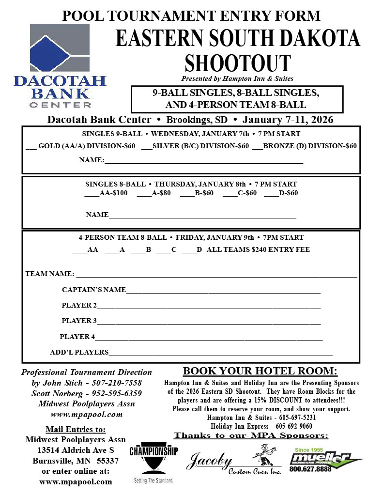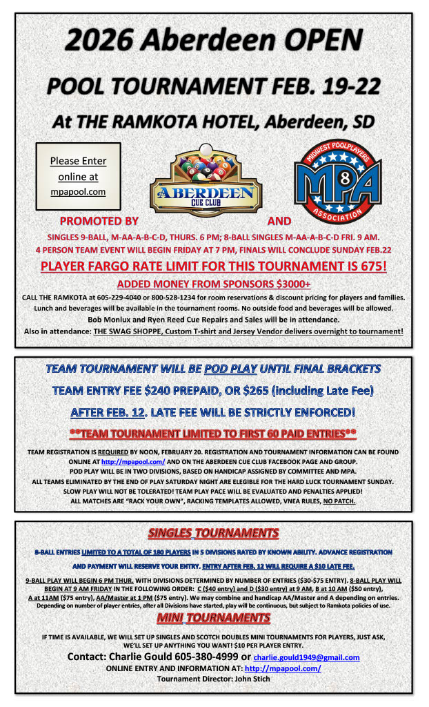 Call the Ramkota at 605-229-4040 or 800-528-1234. Mention Pool Tournament Block